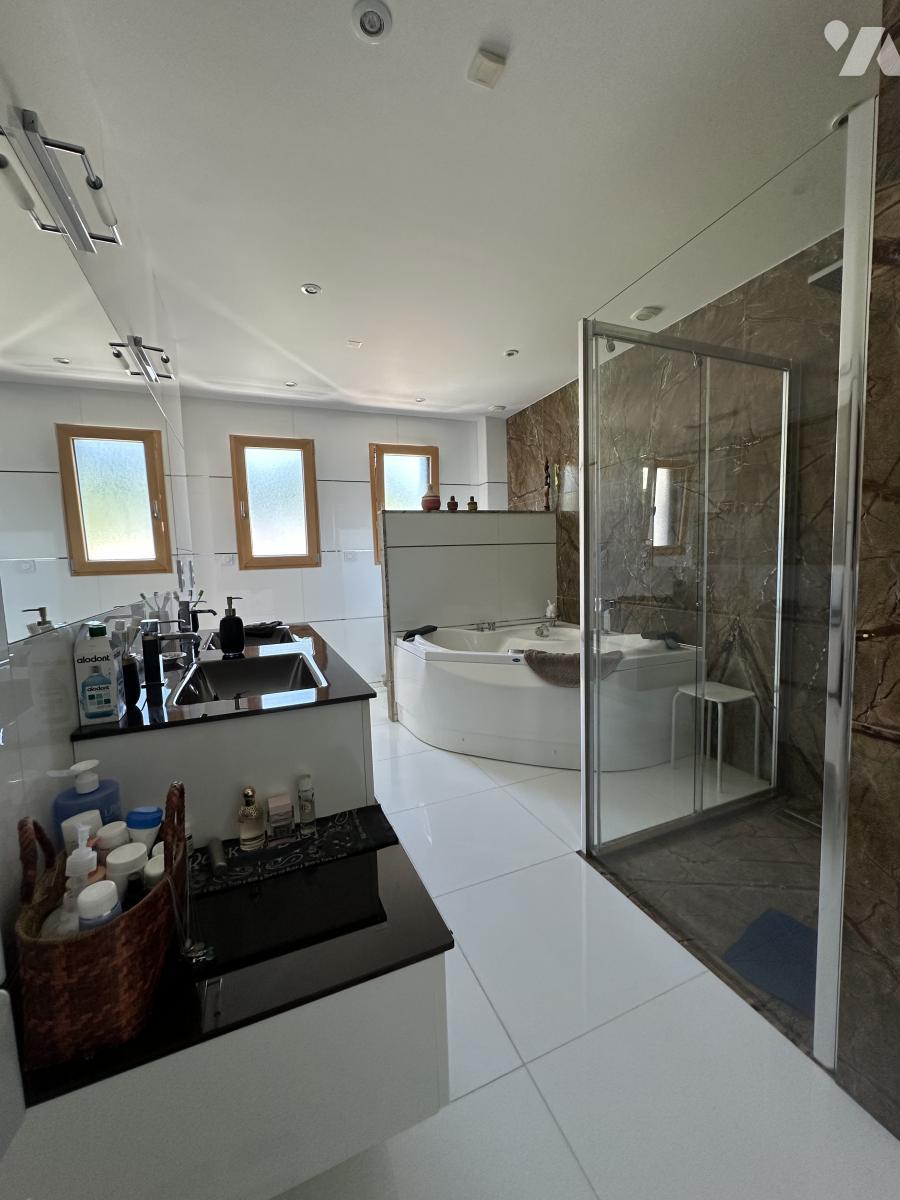 Spacieuse et lumineuse, cette maison de plain pied de 250 m² offre un vaste séjour avec cuisine aménagée équipée, 4chambres, 4wc, 3 salles d'eau +bain.